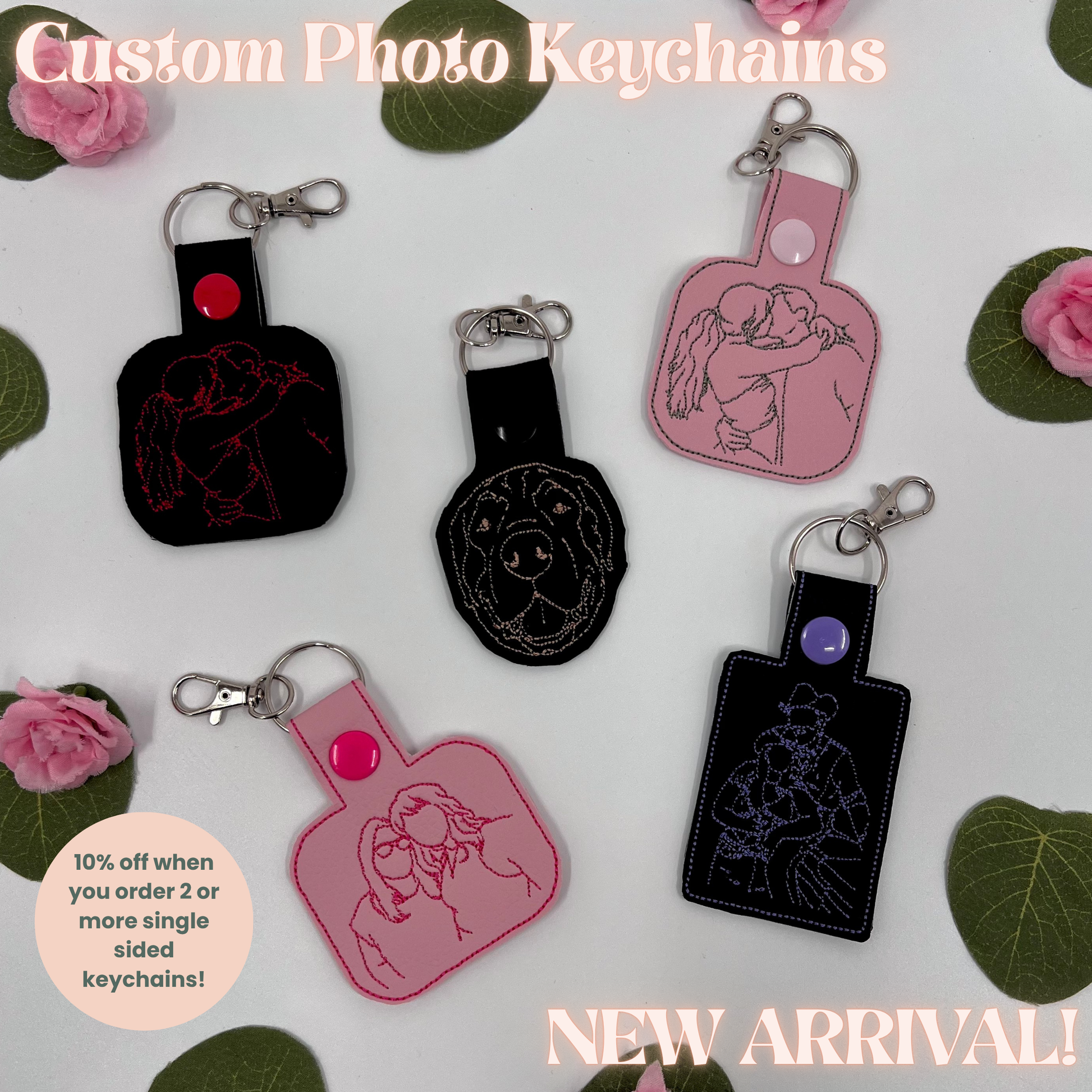 Turn your favorite photo into a photo embroidered masterpiece with this custom keychain! Made with high-quality faux leather, this stylish key charm is a cute way to customize keys while keeping special moments close. Whether it’s a beloved pet, a family portrait, or a cherished memory, we’ll transform your image into a beautifully stitched design.