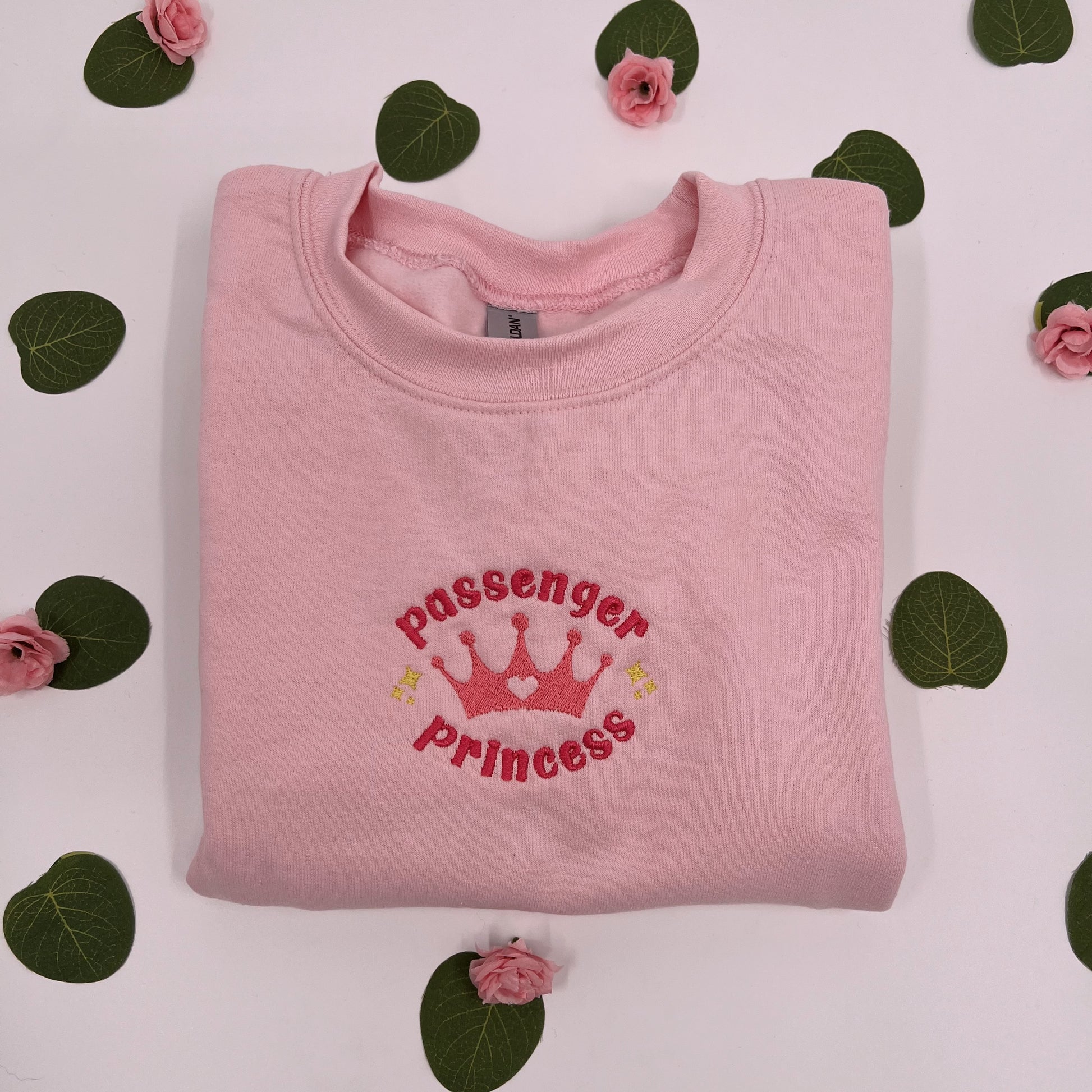 Take a fashionable ride with the Passenger Princess Crewneck! This light pink crewneck features a charming pink threaded design including a pink crown in the center, accented with bright yellow sparkles on either side. This will be your go to sweatshirt for car rides - you'll look cute and stylish, yet stay comfy while riding in the passenger seat of your man's car. Everyone will know you're his Passenger Princess!