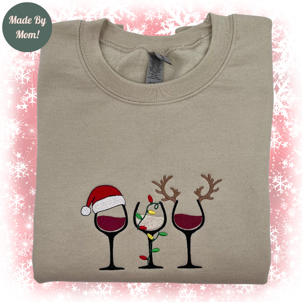 - Embroidered Details: This high-quality sweatshirt features beautiful embroidery of a wine glass set, Santa hat, Christmas lights, and reindeer ears that will add a touch of festive cheer to any outfit.