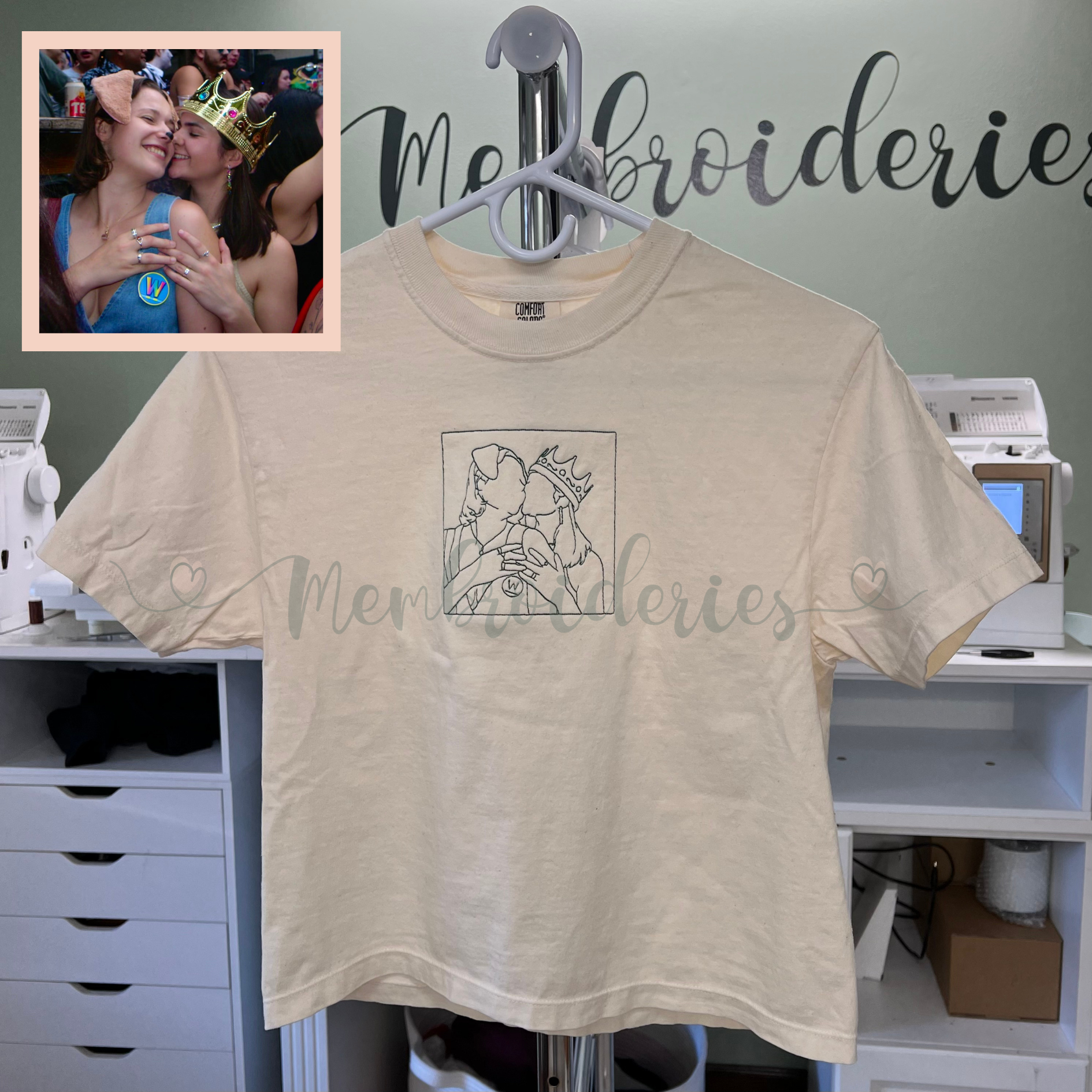 What sets this tee apart is the ability to make it uniquely yours. With our hand drawn artwork and high-quality embroidery, you can immortalize your favorite memories by having your own photo beautifully stitched onto the fabric. Whether it's a cherished moment captured in time or a beloved pet's adorable face, our embroidery brings your personal touch to life.